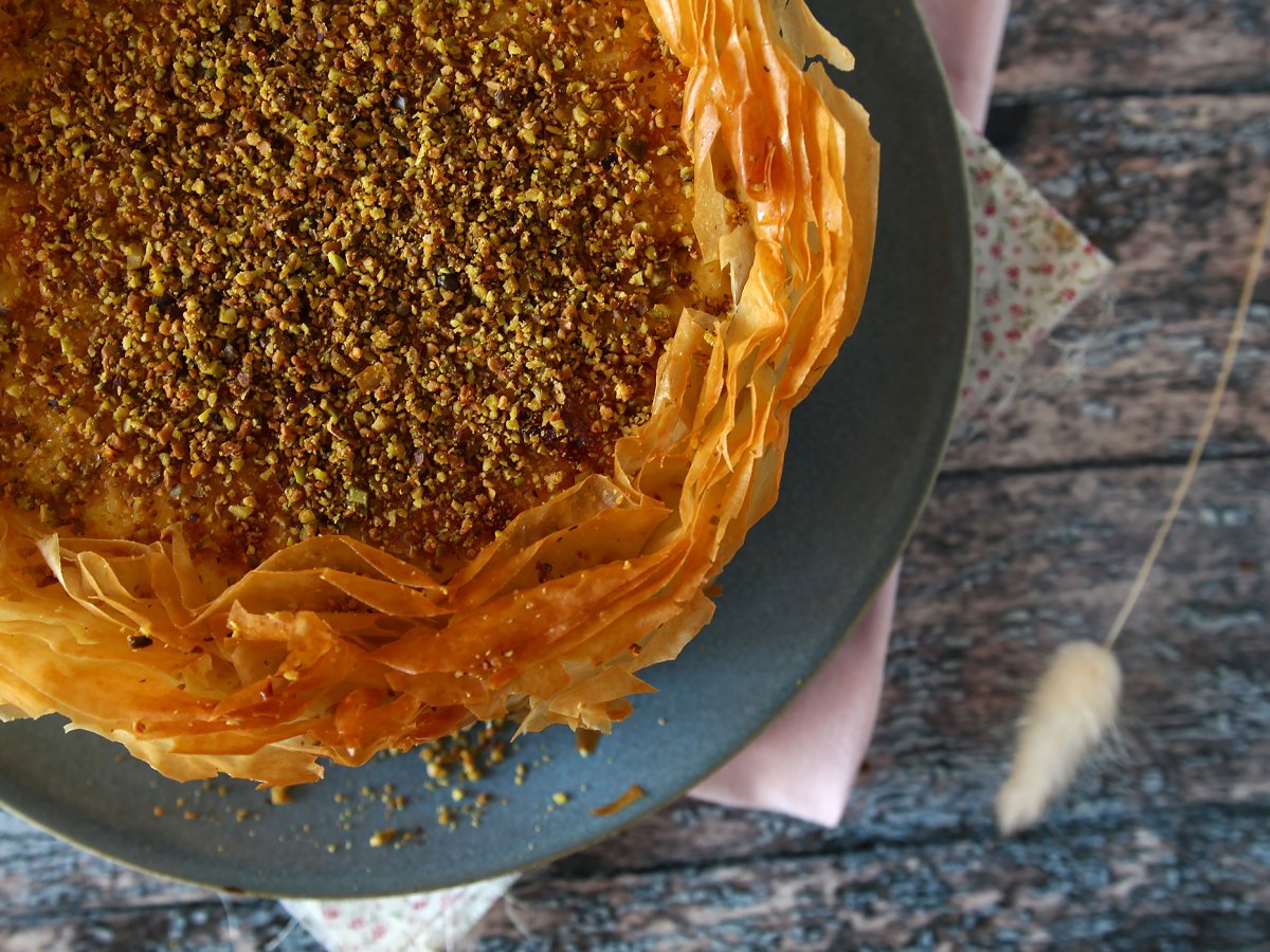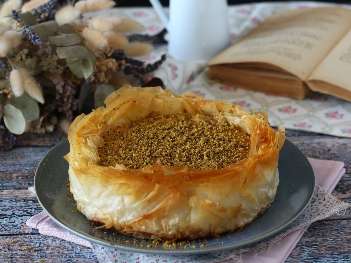 Baklava-kaascake met pistache, knapperig en smeltend