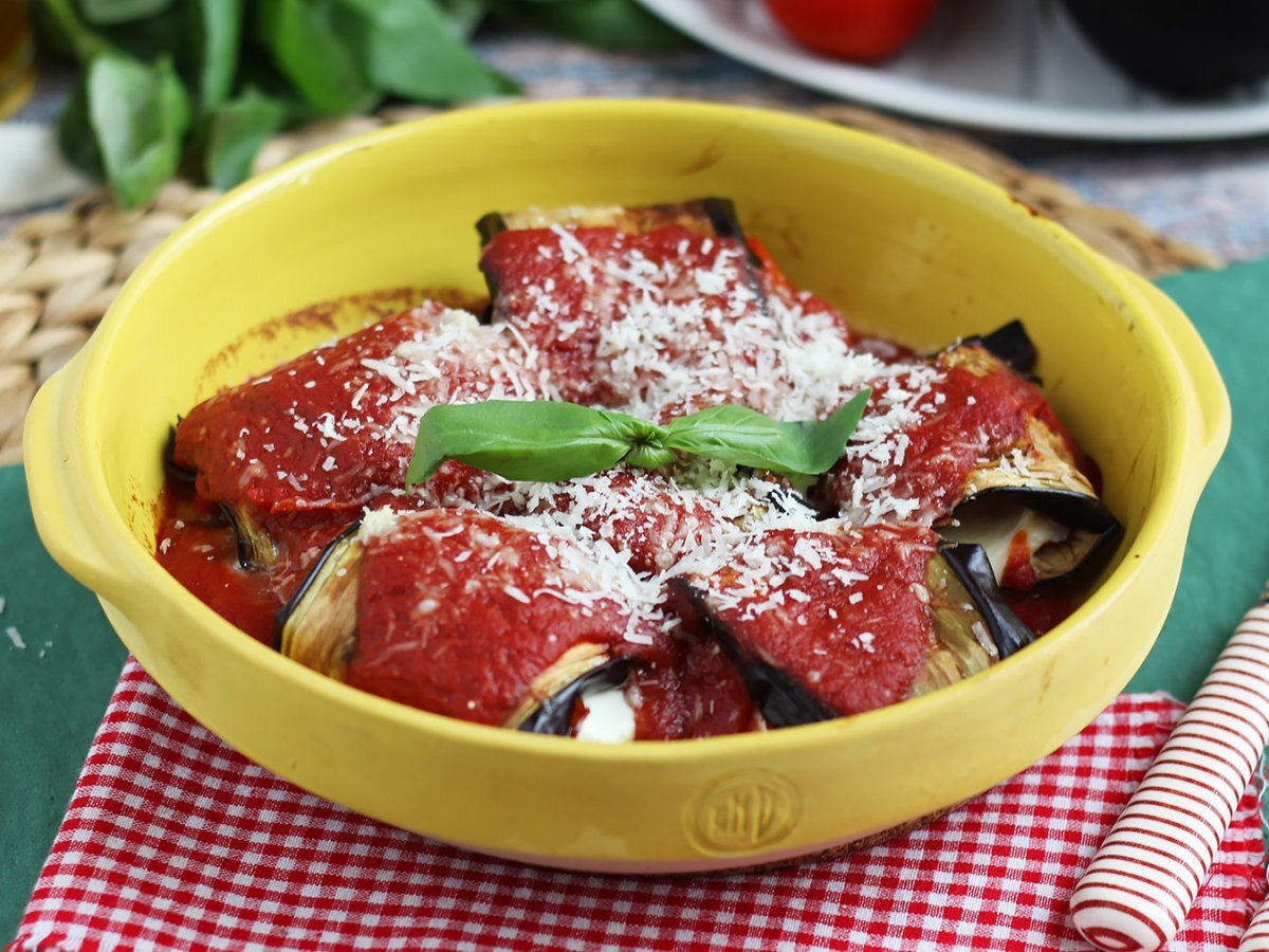 Laat het hele gezin met plezier groenten eten dankzij onze aubergineschotel! Gerold met tomaten en mozzarella kaas, overgoten met tomatensaus en parmezaan.... een echte traktatie! Eet als een enkel gerecht voor een vegetarische maaltijd, of serveer als bijgerecht :-)