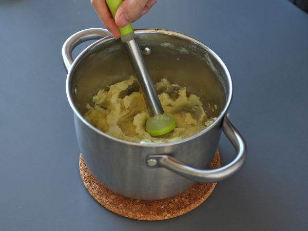 Giet al het water af en stamp de aardappelen. Voeg vervolgens de olijfolie toe. Kruid met peper en zout.