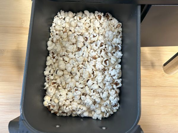 Aan het einde van het bakproces kan de popcorn blijven poppen, dus laat de Air Fryer nog 2 minuten dicht.