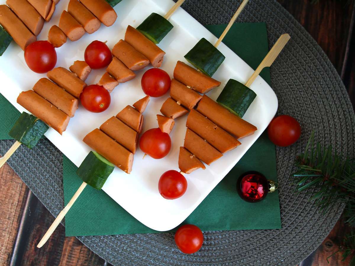 De belangrijkste ingrediënten zijn 12 kerstomaten, 12 knakworsten (bij voorkeur vegetarisch) en 1/4 komkommer.